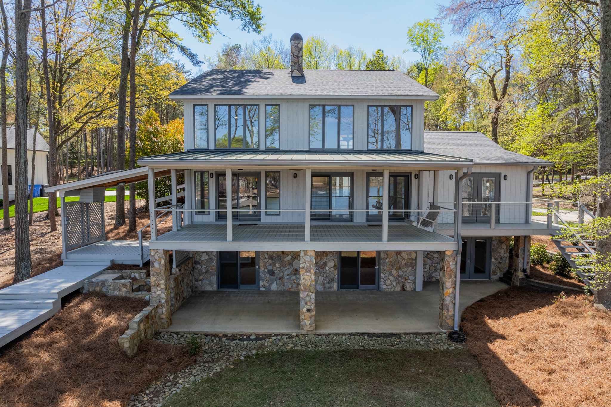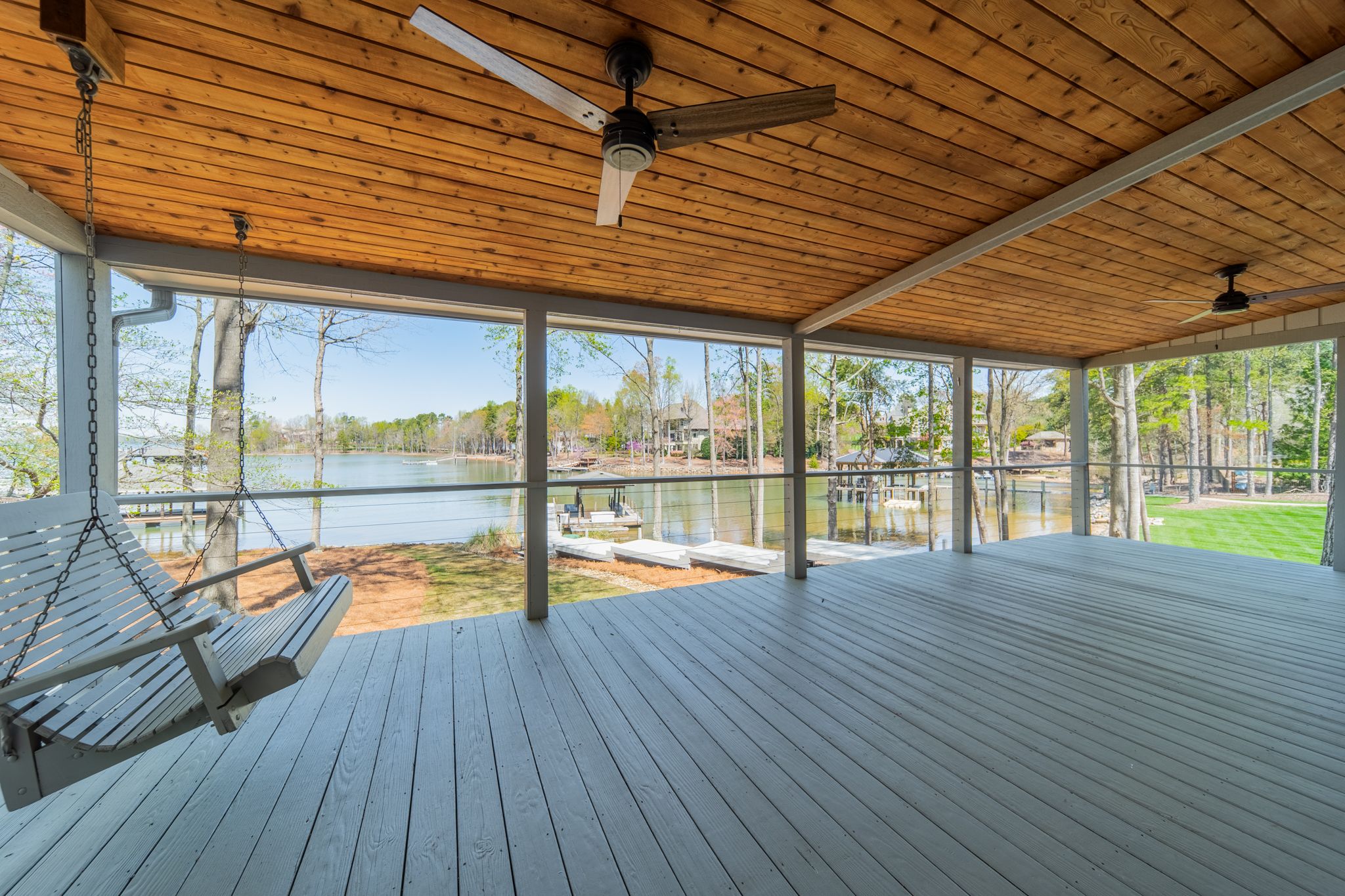 Step outside onto the covered porch and take in the breathtaking sunset views, as the sun casts its gleaming colors across the glistening waters of the lake. The spacious porch is perfect for watching sunsets or walk down to the serene backyard and enjoy a an afternoon nap among the tall pines, listening to the gentle sounds of nature.