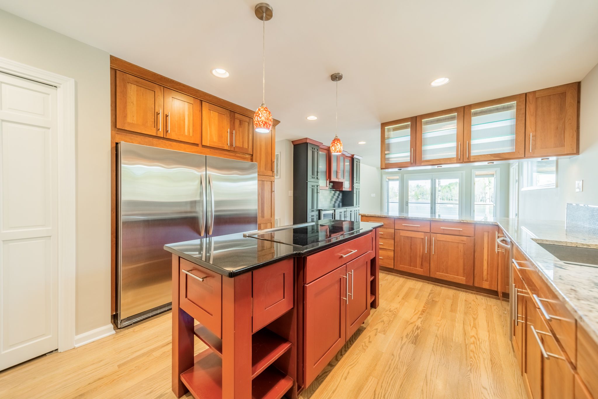 This kitchen is a dream to prepare meals and entertain guests. A fresh modern look with custom cabinets flows easily to the lakefront dining area. This custom space features custom cabinets with organizational inserts, spacious island, stainless appliances, hardwood floors, designer lighting and so much more. Perfect for preparing a gourmet meal for family and friends!
